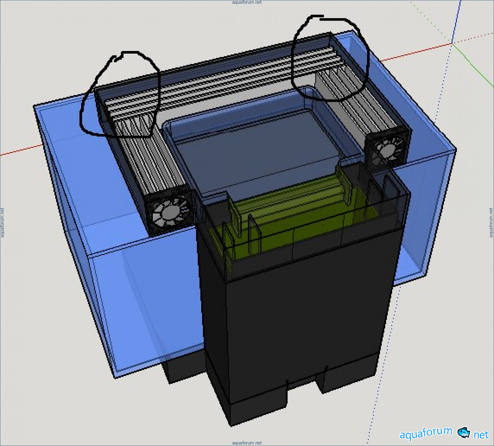 Ниже схемы, как я планирую это все разместить. Зеленым отмечен самп. Оранжевым - помпа (размеры Eheim Compact 600).