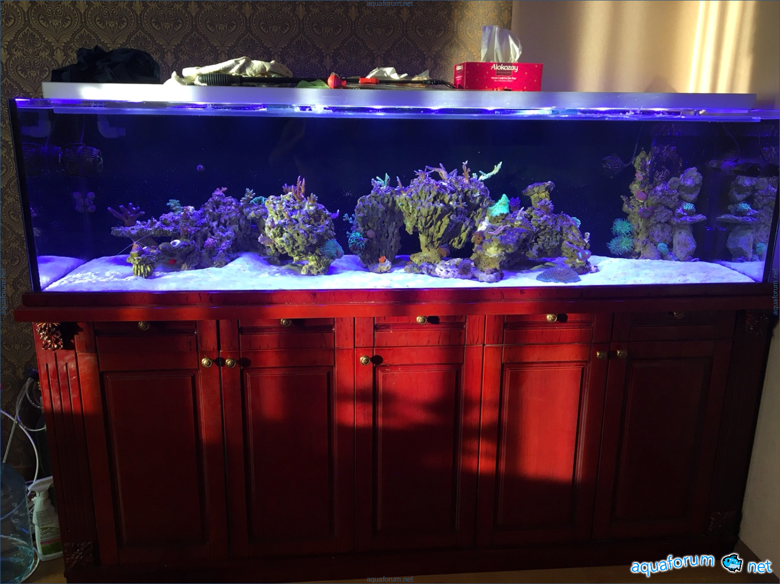 Потом неделю заливал осмос в аквариум.. засолил 27.. августа 2017.. потом засыпал писок живой 40 кг с айрифа..бактерии 4 кг жика с колесс.. и включил свет на полную..( свет 600 ват делал рей.. аирсофт..)