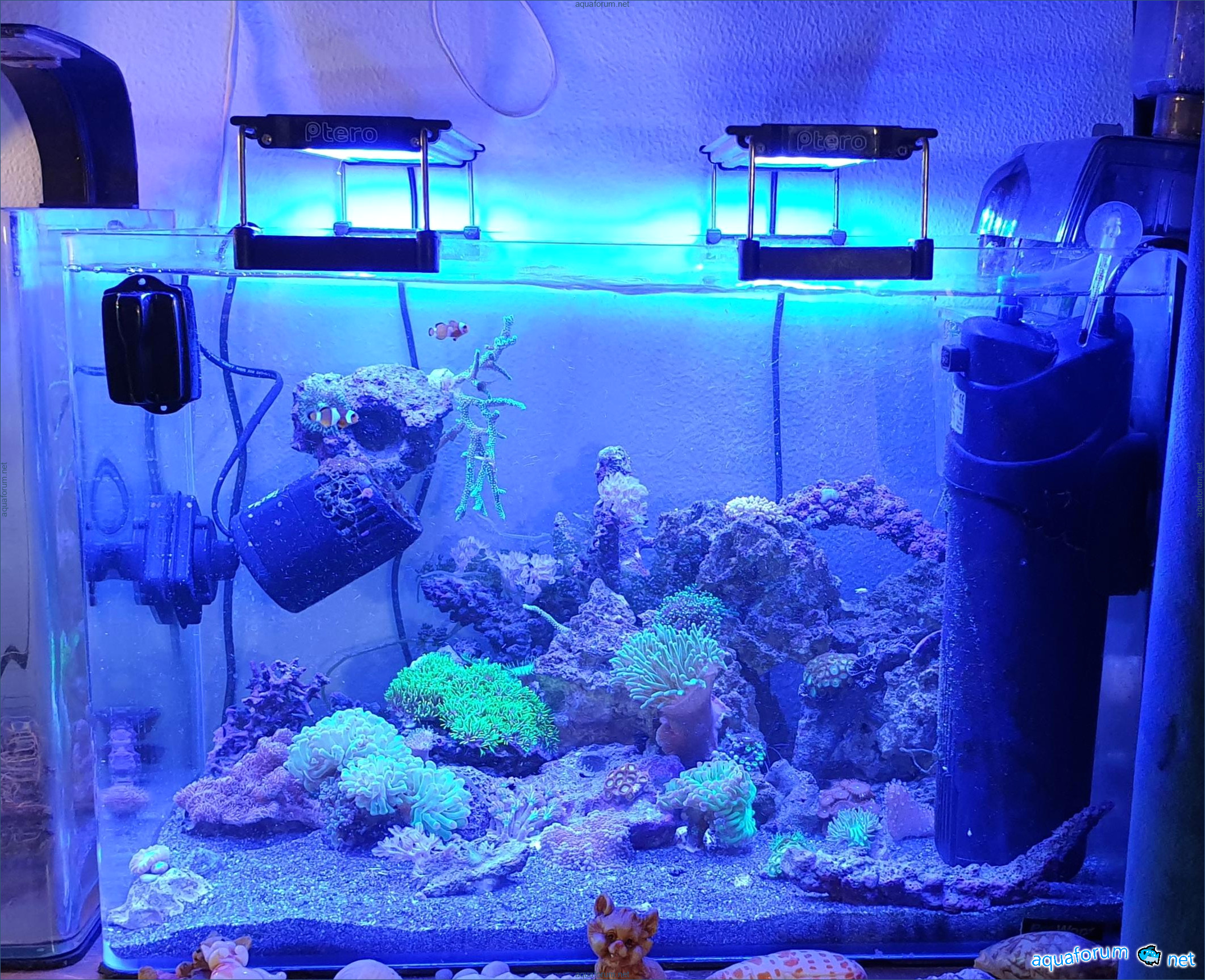 Около года я хотел и планировал морской аквариум. В результате на мои скромные студенческие доходы я раздобыл сосуд на 58 литров, наноскиммер, помпу на 1000 л/час и два светильника Ptero Reef(по 17 ватт каждый). Далее я залил воду, бактерии, бросил живой чёрный песок и оставил это на полмесяца, после чего и положил 3 килограмма бояЖ.К. (живые камни). И красиво, и на мой объем подходит. Через недели две мной были взяты ещё 3 кг камня, уже сухого.