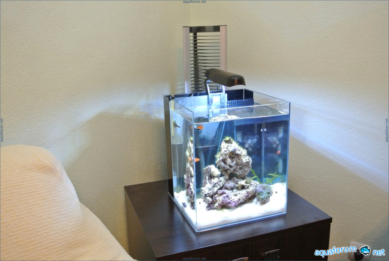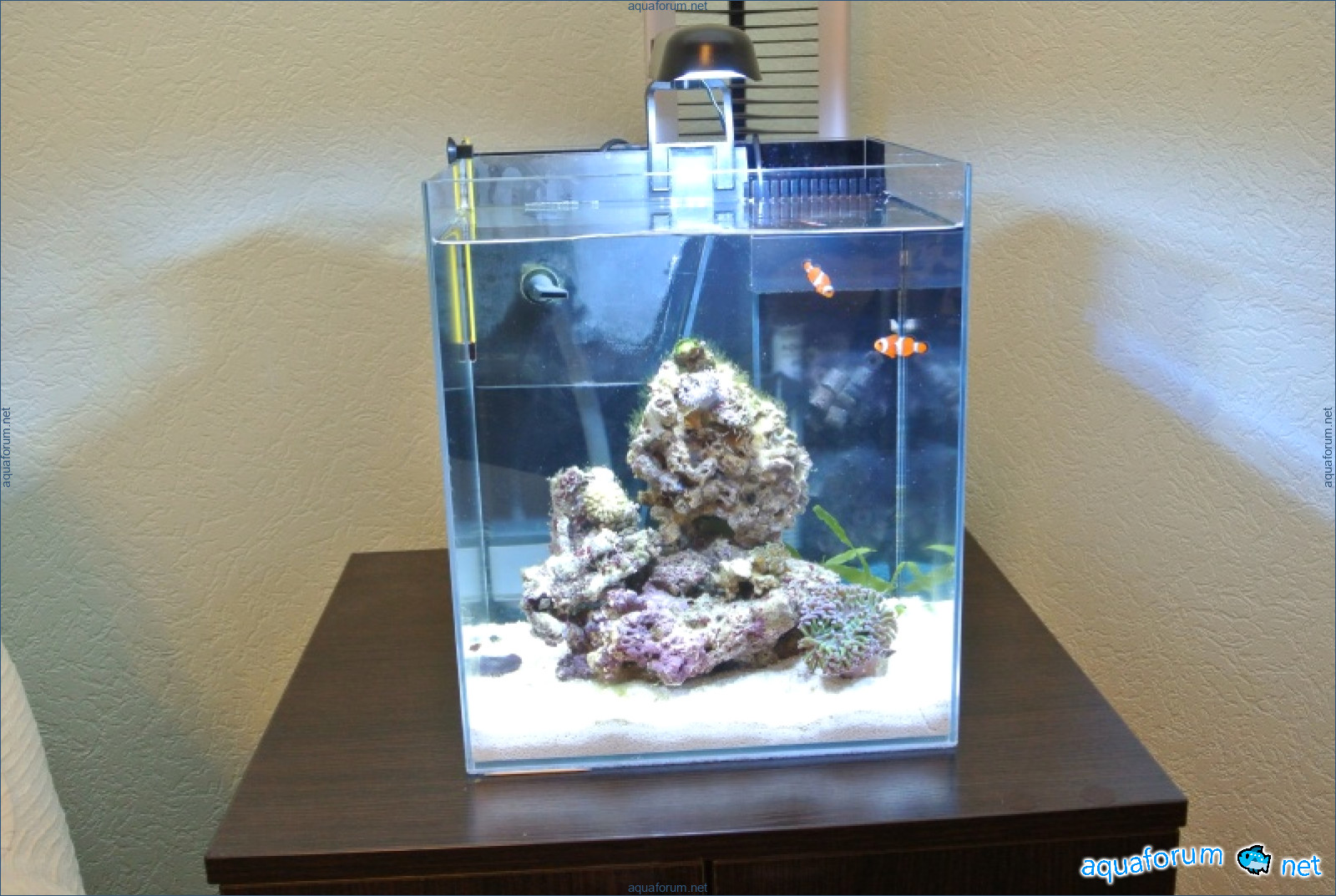 நான் எனது வீட்டில் ஒரு நானோ கடல் அக்வேரியம் உருவாக்குவது குறித்து நீண்ட நேரம் யோசித்தேன். கடல் அக்வேரியத்திற்கு நல்ல வடிகட்டுதல் தேவை என்பதால், 30*30*35 அளவுள்ள ஒரு அக்வேரியத்தை ஒட்டி, அதில் ஒரு பகிர்வை ஒட்டி, அந்தப் பகிர்வில் ஒரு சிறிய வடிப்பானை உருவாக்க முடிவு செய்தேன். எல்லாம் பொருந்தும் வகையில் பகிர்வுகளை எவ்வாறு வைப்பது, தண்ணீர் அமைதாக ஓடும் வகையில் எவ்வாறு அமைப்பது என்பதைப் பற்றி நீண்ட நேரம் யோசித்தேன். சரி, முடிவு நன்றாகவே இருப்பதாகத் தோன்றுகிறது. வடிப்பான் சத்தம் செய்யவில்லை, எல்லாம் சரியாக வேலை செய்கிறது. பகிர்வில் ஒரு மூலையை வெட்டி, அங்கு நீர் ஓட்டத்திற்காக ஒரு வலைப்பின்னலை ஒட்டி, ஒரு ஜெட் நோசலை பொருத்துவதற்கான துளையைத் துளைத்தேன். இதன் மூலம் ஒரு பம்ப் மூலம் தண்ணீர் மீண்டும் வழங்கப்படும். அக்வேரியத்திற்காக Aquael DecoLight 9W விளக்கை வாங்கி, அதைக் கழற்றி அதில் Cree எல்.ஈ.டி விளக்குகளை பொருத்தி, அதற்கு ஒரு கட்டுப்பாட்டு கன்ட்ரோலரை அசெம்பிள் செய்தேன். எங்கும் கசிவில்லை, சத்தமில்லை, எல்லாம் சரியாக வேலை செய்கிறதா என மீண்டும் சரிபார்த்தேன். பவள துகள்கள் நிறைந்த மண்ணை நிரப்பினேன், உயிர் பாறைகளை வைத்தேன், உப்பு தண்ணீரை ஊற்றினேன். எனது முதல் குடியிருப்பாளரான ஹெர்மிட் கிராப்ஸை வைத்து சில நாட்கள் கவனித்தேன். அதைப் பார்ப்பது மிகவும் சலிப்பாக இருந்தது!!! கொஞ்சம் பணம் எடுத்து சென்று, சில பவளங்களையும் இரண்டு மீன்களையும் வாங்கினேன். வாங்கிய அனைத்தையும் அக்வேரியத்தில் வைத்தேன், இப்போது மாலை நேரங்களில் என் கடல் அக்வேரியத்தின் வாழ்க்கையை அனுபவிக்கிறேன். இதோ தான் இறுதி முடிவு!!!