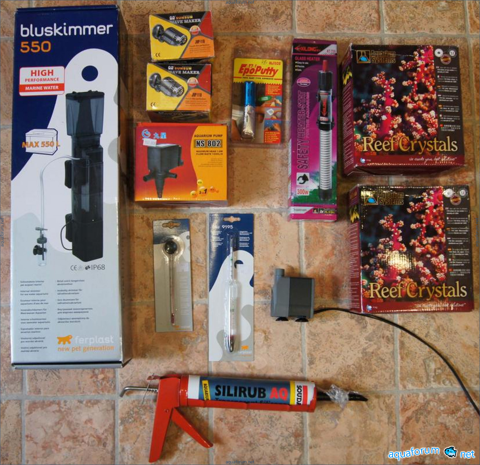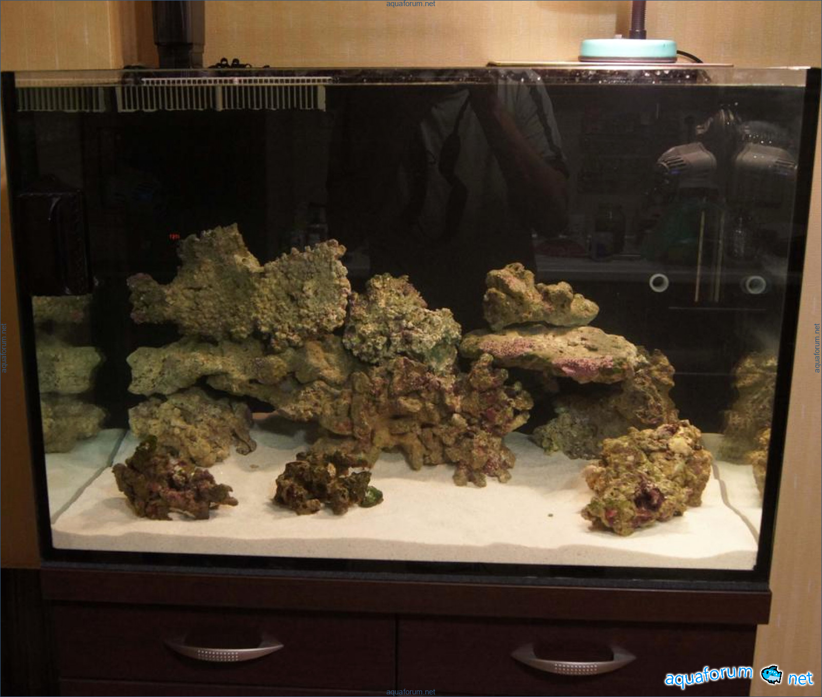 02.02.15 - Bu günün akşamı boş akvaryumda su tuzlama işlemi, ~13 kg canlı kaya + 30 lt çalışan akvaryum suyu + küçük bir heta parçası almak için seyahat ile geçti. Hepsini akvaryuma attım. Su seviyesini ve gerekli tuzluluğu basit bir kompleks ile tamamladım (sonucunda Çinısıtıcısını mahvettim ;( )